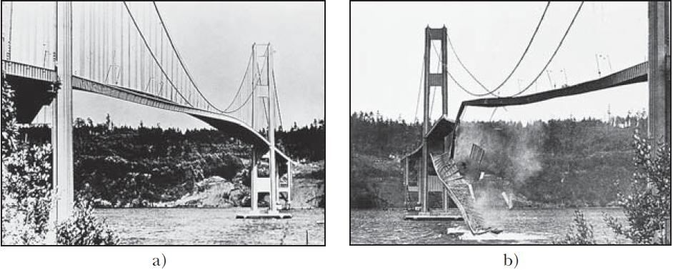 a) En 1940 vientos turbulentos establecieron vibraciones de torsión en el puente Tacoma Narrows, haciendo que oscilara a una frecuencia cercana a una de las frecuencias naturales de la estructura del puente. b) Una vez establecida, esta condición de resonancia condujo al colapso del puente. (UPI/Bettmann Newsphotos)