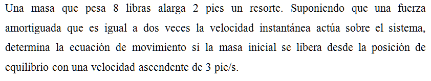 Una masa que pesa 8 libras alarga 2 pies un resorte. Suponiendo que una fuerza amortiguada que es igual a dos veces la velocidad instantánea actúa sobre el sistema, determina la ecuación de movimiento si la masa inicial se libera desde la posición de equilibrio con una velocidad ascendente de 3 pie/s.