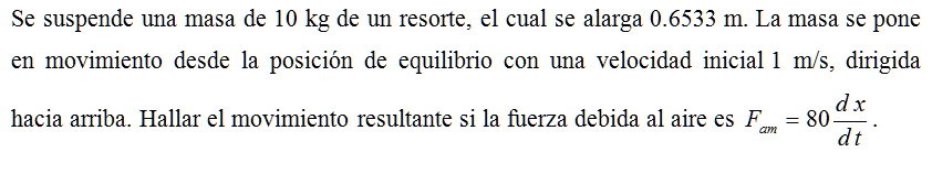 Se suspende una masa de 10 kg de un resorte, el cual se alarga 0.6533 m. La masa se pone en movimiento desde la posición de equilibrio con una velocidad inicial 1 m/s, dirigida hacia arriba. Hallar el movimiento resultante si la fuerza debida al aire es \( \displaystyle F_{am}=80\frac{d\,x}{d\,t}\).