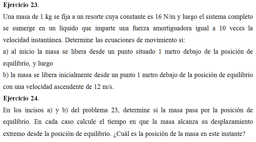 En los incisos a) y b) del problema 23, determine si la masa pasa por la posición de equilibrio. En cada caso calcule el tiempo en que la masa alcanza su desplazamiento extremo desde la posición de equilibrio. ¿Cuál es la posición de la masa en este instante?