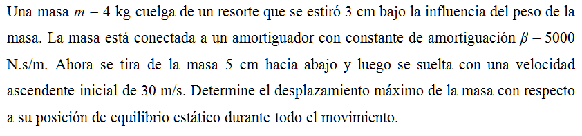 Una masa m = 4 kg cuelga de un resorte que se estiró 3 cm bajo la influencia del peso de la masa. La masa está conectada a un amortiguador con constante de amortiguación β = 5000 N.s/m. Ahora se tira de la masa 5 cm hacia abajo y luego se suelta con una velocidad ascendente inicial de 30 m/s. Determine el desplazamiento máximo de la masa con respecto a su posición de equilibrio estático durante todo el movimiento.