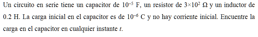 Un circuito en serie tiene un capacitor de 10–5 F, un resistor de 3×102 Ω y un inductor de 0.2 H. La carga inicial en el capacitor es de 10–6 C y no hay corriente inicial. Encuentre la carga en el capacitor en cualquier instante t.
