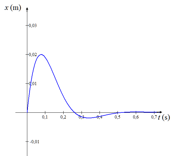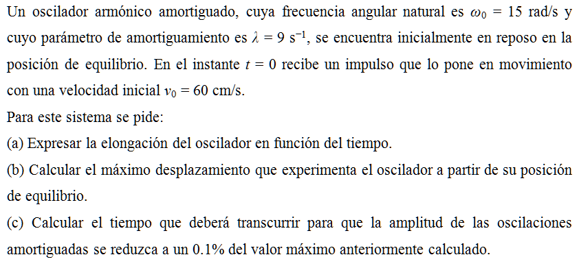 Un oscilador armónico amortiguado, cuya frecuencia angular natural es ω0 = 15 rad/s y cuyo parámetro de amortiguamiento es λ = 9 s−1, se encuentra inicialmente en reposo en la posición de equilibrio. En el instante t = 0 recibe un impulso que lo pone en movimiento con una velocidad inicial v0 = 60 cm/s.