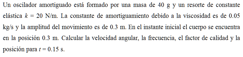 Un oscilador amortiguado está formado por una masa de 40 g y un resorte de constante elástica k = 20 N/m. La constante de amortiguamiento debido a la viscosidad es de 0.05 kg/s y la amplitud del movimiento es de 0.3 m. En el instante inicial el cuerpo se encuentra en la posición 0.3 m. Calcular la velocidad angular, la frecuencia, el factor de calidad y la posición para t = 0.15 s.