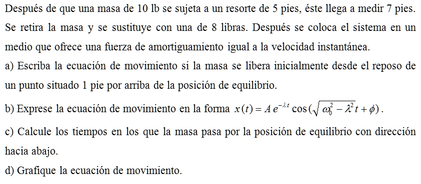 Después de que una masa de 10 lb se sujeta a un resorte de 5 pies, éste llega a medir 7 pies. Se retira la masa y se sustituye con una de 8 libras. Después se coloca el sistema en un medio que ofrece una fuerza de amortiguamiento igual a la velocidad instantánea.