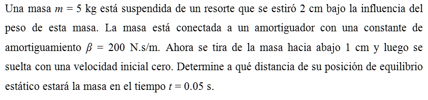 Una masa m = 5 kg está suspendida de un resorte que se estiró 2 cm bajo la influencia del peso de esta masa. La masa está conectada a un amortiguador con una constante de amortiguamiento β = 200 N.s/m. Ahora se tira de la masa hacia abajo 1 cm y luego se suelta con una velocidad inicial cero. Determine a qué distancia de su posición de equilibrio estático estará la masa en el tiempo t = 0.05 s.