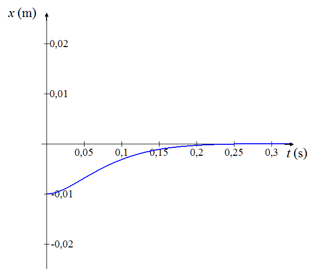 x (t) = – 0.01 e – 20 t [cos (9.52 t) + 2.1008 sen (9.52 t)], x = [m], t = [s]