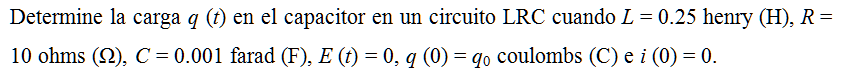 Determine la carga q (t) en el capacitor en un circuito LRC cuando L = 0.25 henry (H), R = 10 ohms (Ω), C = 0.001 farad (F), E (t) = 0, q (0) = q0 coulombs (C) e i (0) = 0.