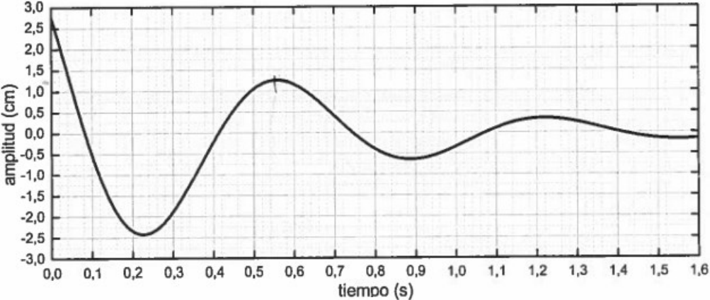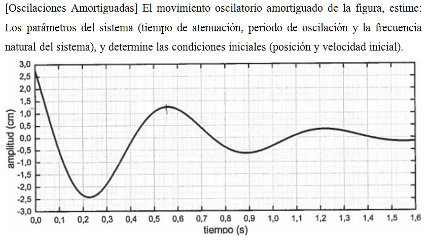 El movimiento oscilatorio amortiguado de la figura, estime: Los parámetros del sistema (tiempo de atenuación, periodo de oscilación y la frecuencia natural del sistema), y determine las condiciones iniciales (posición y velocidad inicial).