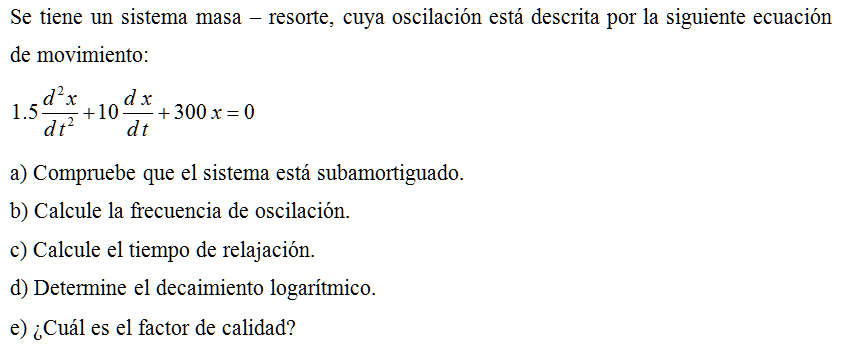 Se tiene un sistema masa – resorte, cuya oscilación está descrita por la siguiente ecuación de movimiento: