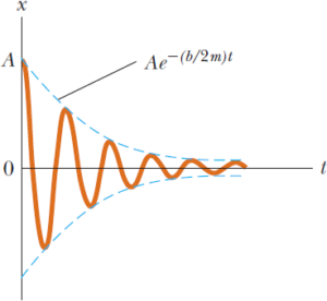 Cuando la fuerza retardadora es pequeña en comparación con la fuerza restauradora máxima, el carácter oscilatorio del movimiento se conserva pero la amplitud disminuye en el tiempo, con el resultado de que al final el movimiento cesa. Cualquier sistema que se comporte de esta forma se conoce como oscilador amortiguado. Las líneas azules discontinuas en la figura, que definen la cubierta de la curva oscilatoria, representan el factor exponencial de la ecuación (2). Ésta cubierta muestra que la amplitud decae exponencialmente con el tiempo. Para movimiento con una constante de resorte y masa de cierto objeto, las oscilaciones se amortiguan más rápidamente para valores más grandes de la fuerza retardadora.