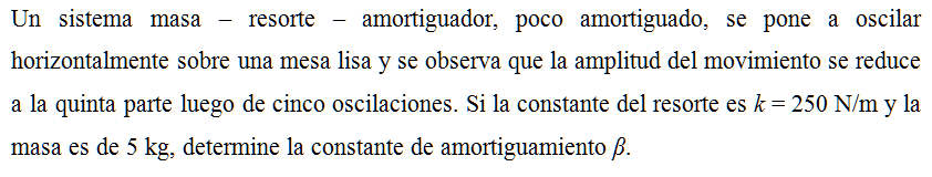 Un sistema masa – resorte – amortiguador, poco amortiguado, se pone a oscilar horizontalmente sobre una mesa lisa y se observa que la amplitud del movimiento se reduce a la quinta parte luego de cinco oscilaciones. Si la constante del resorte es k = 250 N/m y la masa es de 5 kg, determine la constante de amortiguamiento β.