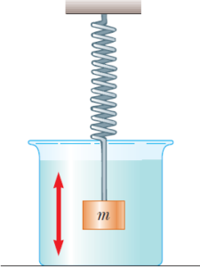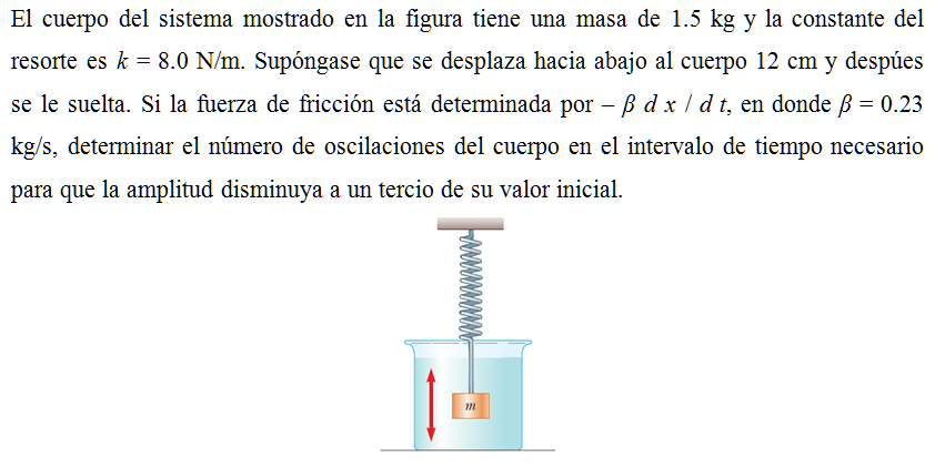El cuerpo del sistema mostrado en la figura tiene una masa de 1.5 kg y la constante del resorte es k = 8.0 N/m. Supóngase que se desplaza hacia abajo al cuerpo 12 cm y despúes se le suelta. Si la fuerza de fricción está determinada por – β d x / d t, en donde β = 0.23 kg/s, determinar el número de oscilaciones del cuerpo en el intervalo de tiempo necesario para que la amplitud disminuya a un tercio de su valor inicial.