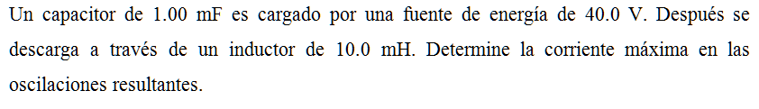 Un capacitor de 1.00 mF es cargado por una fuente de energía de 40.0 V. Después se descarga a través de un inductor de 10.0 mH. Determine la corriente máxima en las oscilaciones resultantes.