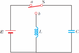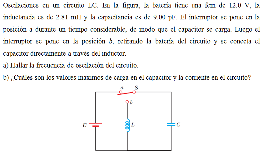 Oscilaciones en un circuito LC. En la figura, la batería tiene una fem de 12.0 V, la inductancia es de 2.81 mH y la capacitancia es de 9.00 pF. El interruptor se pone en la posición a durante un tiempo considerable, de modo que el capacitor se carga. Luego el interruptor se pone en la posición b, retirando la batería del circuito y se conecta el capacitor directamente a través del inductor.