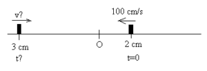 Una partícula de masa de m = 500 g está unida a un muelle de constante k = 200 N/m. Se desplaza la masa 2 cm de la posición de equilibrio, y se le proporciona en el instante inicial t = 0, una velocidad de 100 cm/s hacia la izquierda tal como se muestra en la figura.
