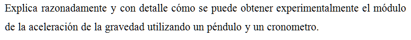 Explica razonadamente y con detalle cómo se puede obtener experimentalmente el módulo de la aceleración de la gravedad utilizando un péndulo y un cronometro.