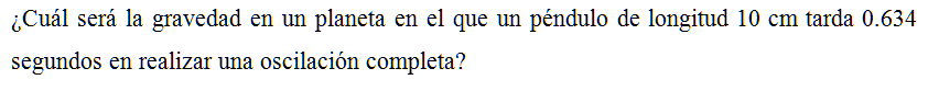 ¿Cuál será la gravedad en un planeta en el que un péndulo de longitud 10 cm tarda 0.634 segundos en realizar una oscilación completa?