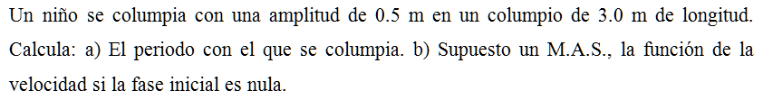 Un niño se columpia con una amplitud de 0.5 m en un columpio de 3.0 m de longitud. Calcula: a) El periodo con el que se columpia. b) Supuesto un M.A.S., la función de la velocidad si la fase inicial es nula.