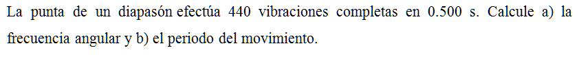 La punta de un diapasón efectúa 440 vibraciones completas en 0.500 s. Calcule a) la frecuencia angular y b) el periodo del movimiento.