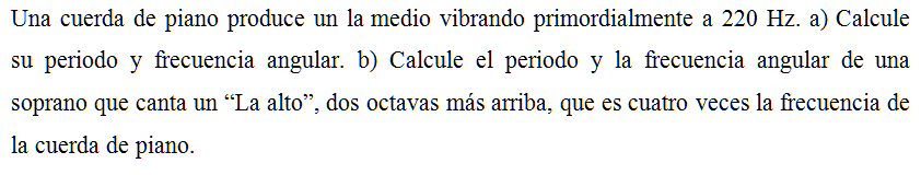 Una cuerda de piano produce un la medio vibrando primordialmente a 220 Hz. a) Calcule su periodo y frecuencia angular. b) Calcule el periodo y la frecuencia angular de una soprano que canta un “La alto”, dos octavas más arriba, que es cuatro veces la frecuencia de la cuerda de piano.