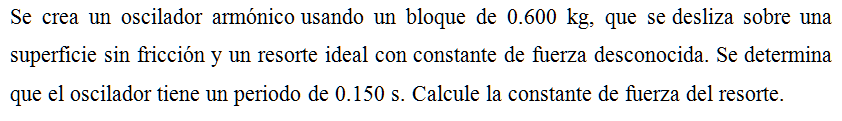 Se crea un oscilador armónico usando un bloque de 0.600 kg, que se desliza sobre una superficie sin fricción y un resorte ideal con constante de fuerza desconocida. Se determina que el oscilador tiene un periodo de 0.150 s. Calcule la constante de fuerza del resorte.