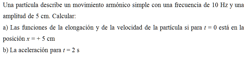 Respuesta: a) x (t) = 0.05 cos (20 π t) m, v (t) = – π sen (20 π t) m/s b) a (2 s) = 197.39 m/s2