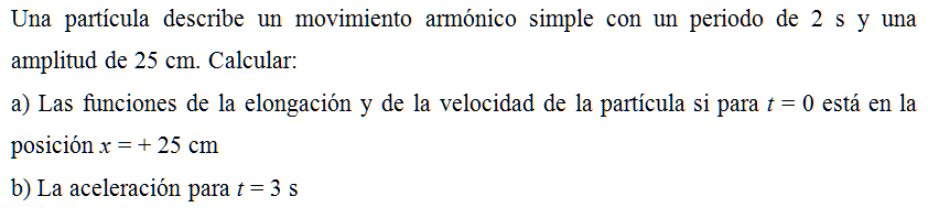 Respuesta: x (t) = 0.25 cos (π t) m, v (t) = – 0.25 π sen (π t) m/s; b) a (3 s) = 2.47 m/s2