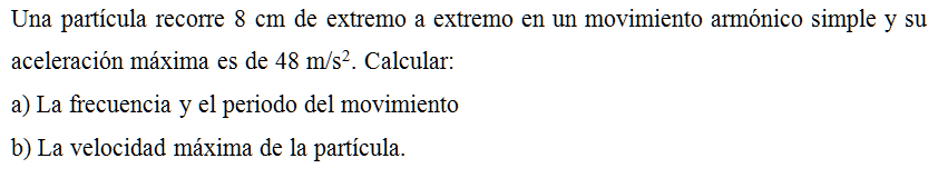 Una partícula recorre 8 cm de extremo a extremo en un movimiento armónico simple y su aceleración máxima es de 48 m/s2. Calcular: