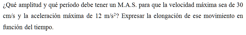 ¿Qué amplitud y qué período debe tener un M.A.S. para que la velocidad máxima sea de 30 cm/s y la aceleración máxima de 12 m/s2? Expresar la elongación de ese movimiento en función del tiempo.