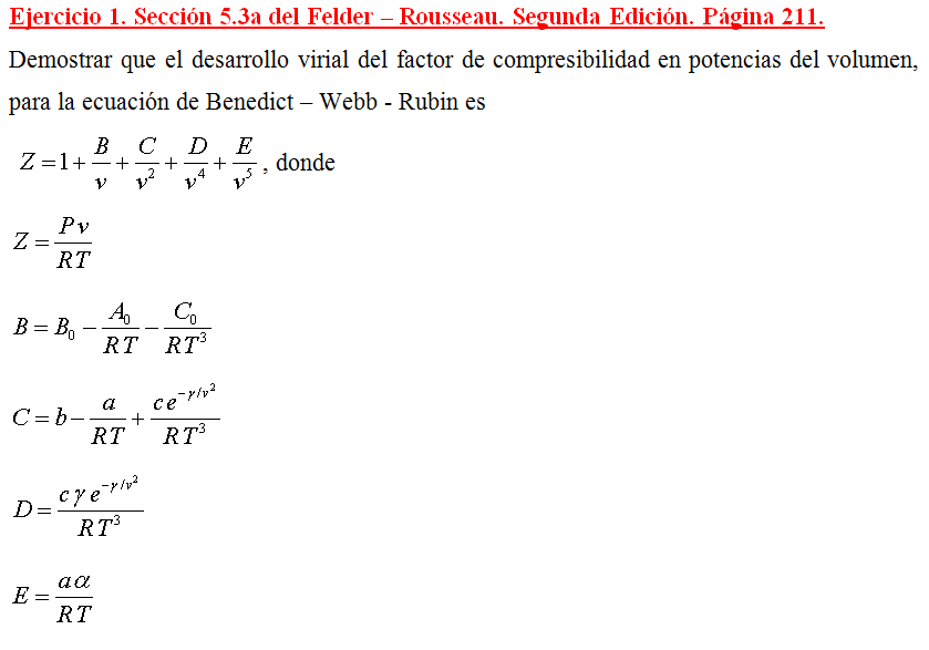 Demostrar que el desarrollo virial del factor de compresibilidad en potencias del volumen, para la ecuación de Benedict – Webb – Rubin es