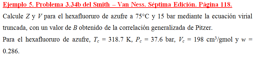 Calcule Z y V para el hexafluoruro de azufre a 75°C y 15 bar mediante la ecuación virial truncada, con un valor de B obtenido de la correlación generalizada de Pitzer.