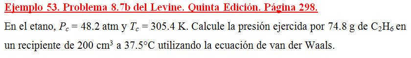 En el etano, Pc = 48.2 atm y Tc = 305.4 K. Calcule la presión ejercida por 74.8 g de C2H6 en un recipiente de 200 cm3 a 37.5°C utilizando la ecuación de van der Waals.