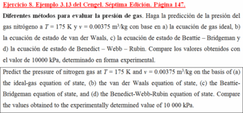 Diferentes métodos para evaluar la presión de gas. Haga la predicción de la presión del gas nitrógeno a T = 175 K y v = 0.00375 m3/kg con base en a) la ecuación de gas ideal, b) la ecuación de estado de van der Waals, c) la ecuación de estado de Beattie – Bridgeman y d) la ecuación de estado de Benedict – Webb – Rubin. Compare los valores obtenidos con el valor de 10000 kPa, determinado en forma experimental.