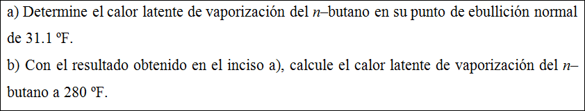 b) Con el resultado obtenido en el inciso a), calcule el calor latente de vaporización del n–butano a 280 ºF.