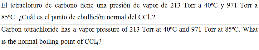 El tetracloruro de carbono tiene una presión de vapor de 213 Torr a 40ºC y 971 Torr a 85ºC. ¿Cuál es el punto de ebullición normal del CCl4?