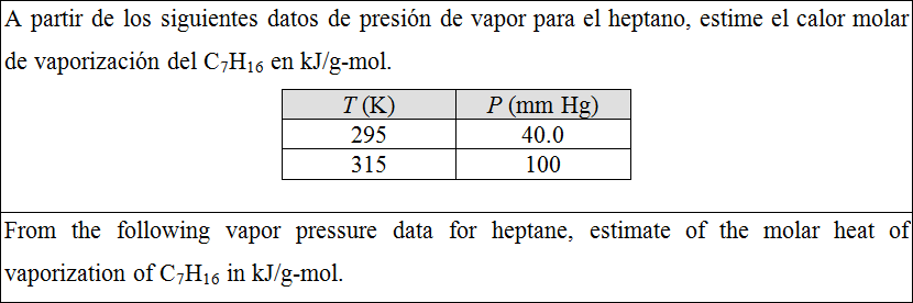 A partir de los siguientes datos de presión de vapor para el heptano, estime el calor molar de vaporización del C7H16 en kJ/g-mol.