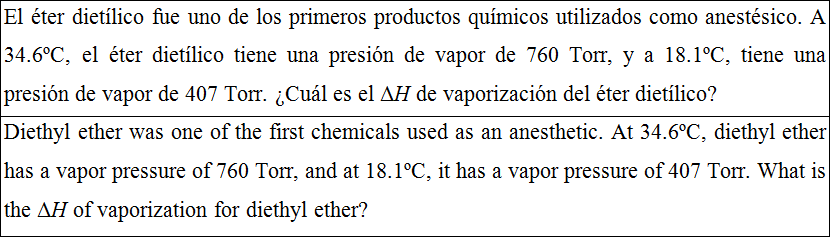 El éter dietílico fue uno de los primeros productos químicos utilizados como anestésico. A 34.6ºC, el éter dietílico tiene una presión de vapor de 760 Torr, y a 18.1ºC, tiene una presión de vapor de 407 Torr. ¿Cuál es el ΔH de vaporización del éter dietílico?