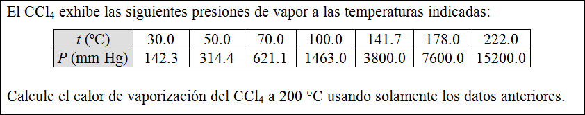 Calcule el calor de vaporización del CCl4 a 200 °C usando solamente los datos anteriores.