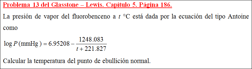 La presión de vapor del fluorobenceno a t °C está dada por la ecuación del tipo Antoine como