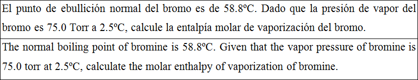 El punto de ebullición normal del bromo es de 58.8ºC. Dado que la presión de vapor del bromo es 75.0 Torr a 2.5ºC, calcule la entalpía molar de vaporización del bromo.