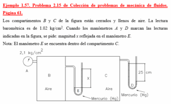 Los compartimentos B y C de la figura están cerrados y llenos de aire. La lectura barométrica es de 1.02 kg/cm2. Cuando los manómetros A y D marcan las lecturas indicadas en la figura, se pide: magnitud x reflejada en el manómetro E.