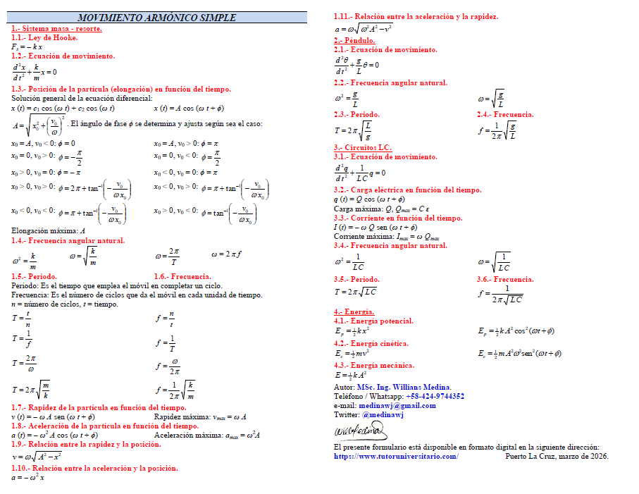 Formulario de movimiento armónico simple.