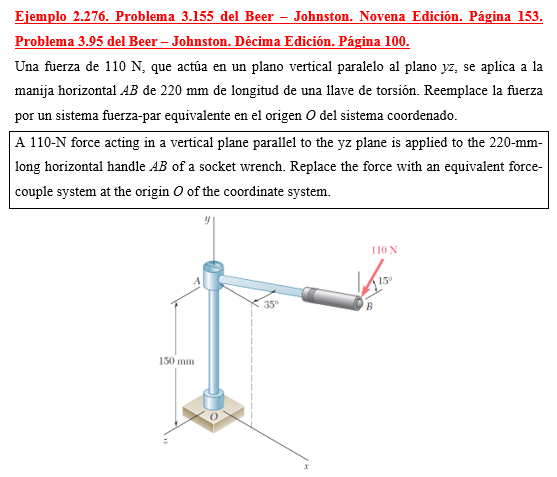 Una fuerza de 110 N, que actúa en un plano vertical paralelo al plano yz, se aplica a la manija horizontal AB de 220 mm de longitud de una llave de torsión. Reemplace la fuerza por un sistema fuerza-par equivalente en el origen O del sistema coordenado.