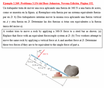 Un trabajador trata de mover una roca aplicando una fuerza de 360 N a una barra de acero, como se muestra en la figura. a) Reemplace esta fuerza por un sistema equivalente fuerza-par en D. b) Dos trabajadores intentan mover la misma roca aplicando una fuerza vertical en A y otra fuerza en D. Determine las dos fuerzas si éstas son equivalentes a la fuerza única del inciso a).