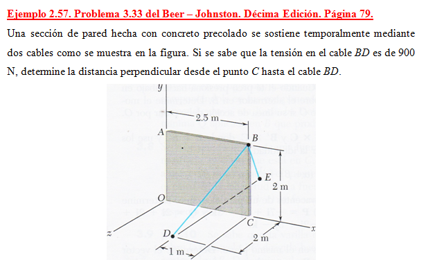 Una sección de pared hecha con concreto precolado se sostiene temporalmente mediante dos cables como se muestra en la figura. Si se sabe que la tensión en el cable BD es de 900 N, determine la distancia perpendicular desde el punto C hasta el cable BD.