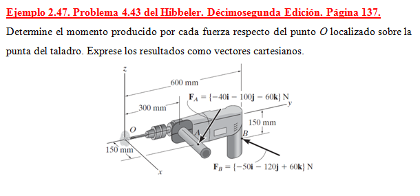 Determine el momento producido por cada fuerza respecto del punto O localizado sobre la punta del taladro. Exprese los resultados como vectores cartesianos.