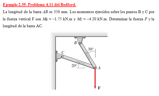 La longitud de la barra AB es 350 mm. Los momentos ejercidos sobre los puntos B y C por la fuerza vertical F son MB = –1.75 kN.m y MC = –4.20 kN.m. Determinar la fuerza F y la longitud de la barra AC.