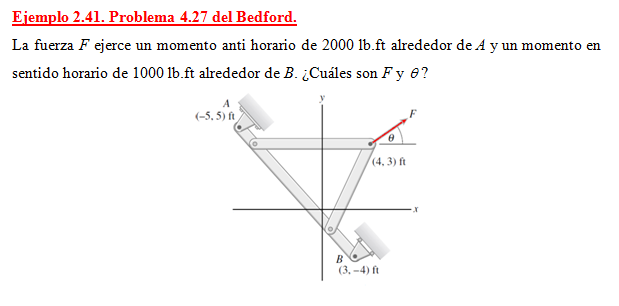La fuerza F ejerce un momento anti horario de 2000 lb.ft alrededor de A y un momento en sentido horario de 1000 lb.ft alrededor de B. ¿Cuáles son F y θ?