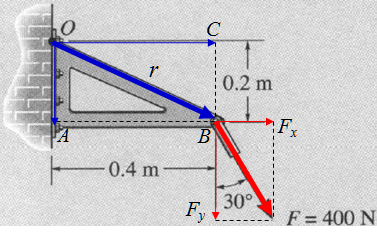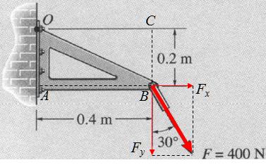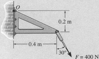 La fuerza F = 400 N actúa en el extremo de la ménsula mostrada en la figura. Determine el momento de la fuerza con respecto al punto O.